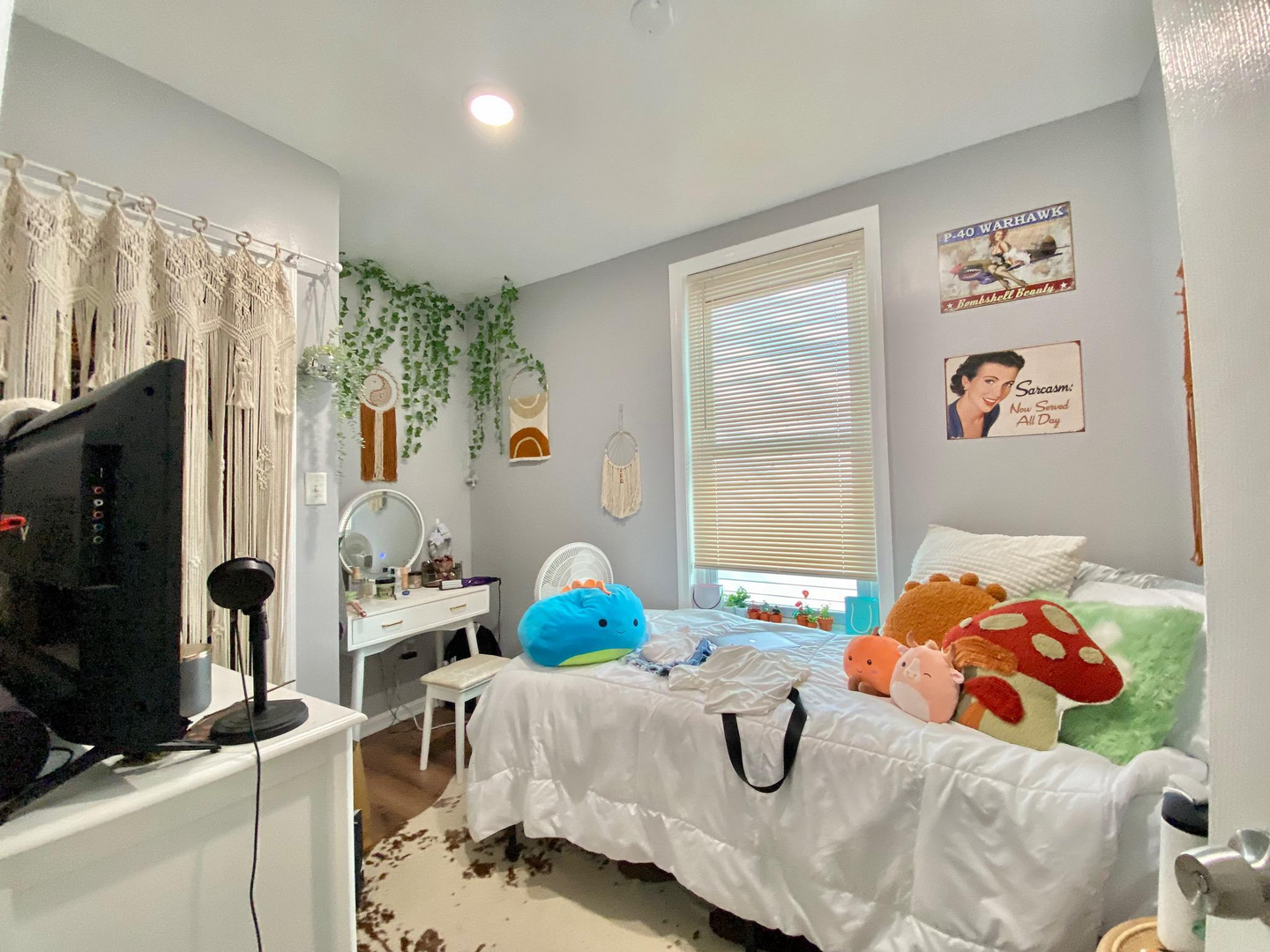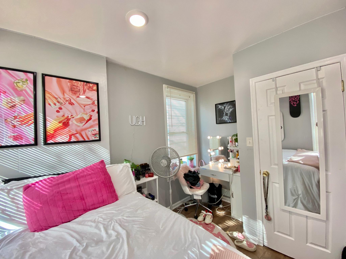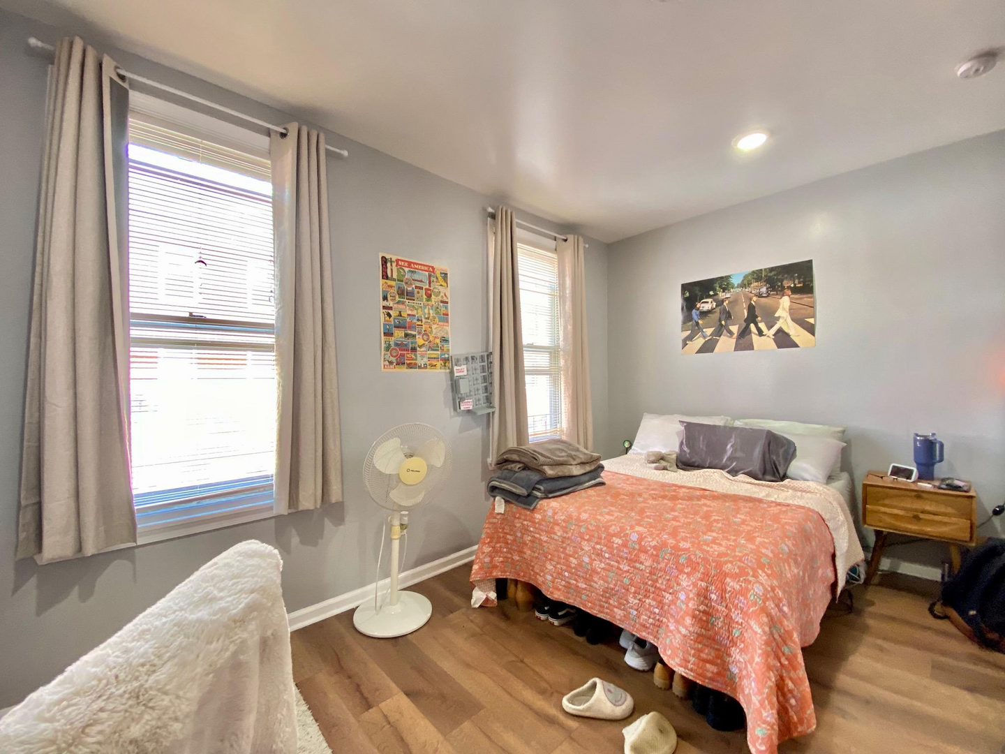 The house has a spacious living room, a lot of natural light, a semi-finished basement, a well-sized backyard, 2 full baths, window units, and forced-air heating. Rooms can easily fit a full-size bed, a desk, a dresser and they have spacious closets. Utilities on average are around $50-60/mo per person. First last and security is required to move in. Private, caring owner! Video tour available.